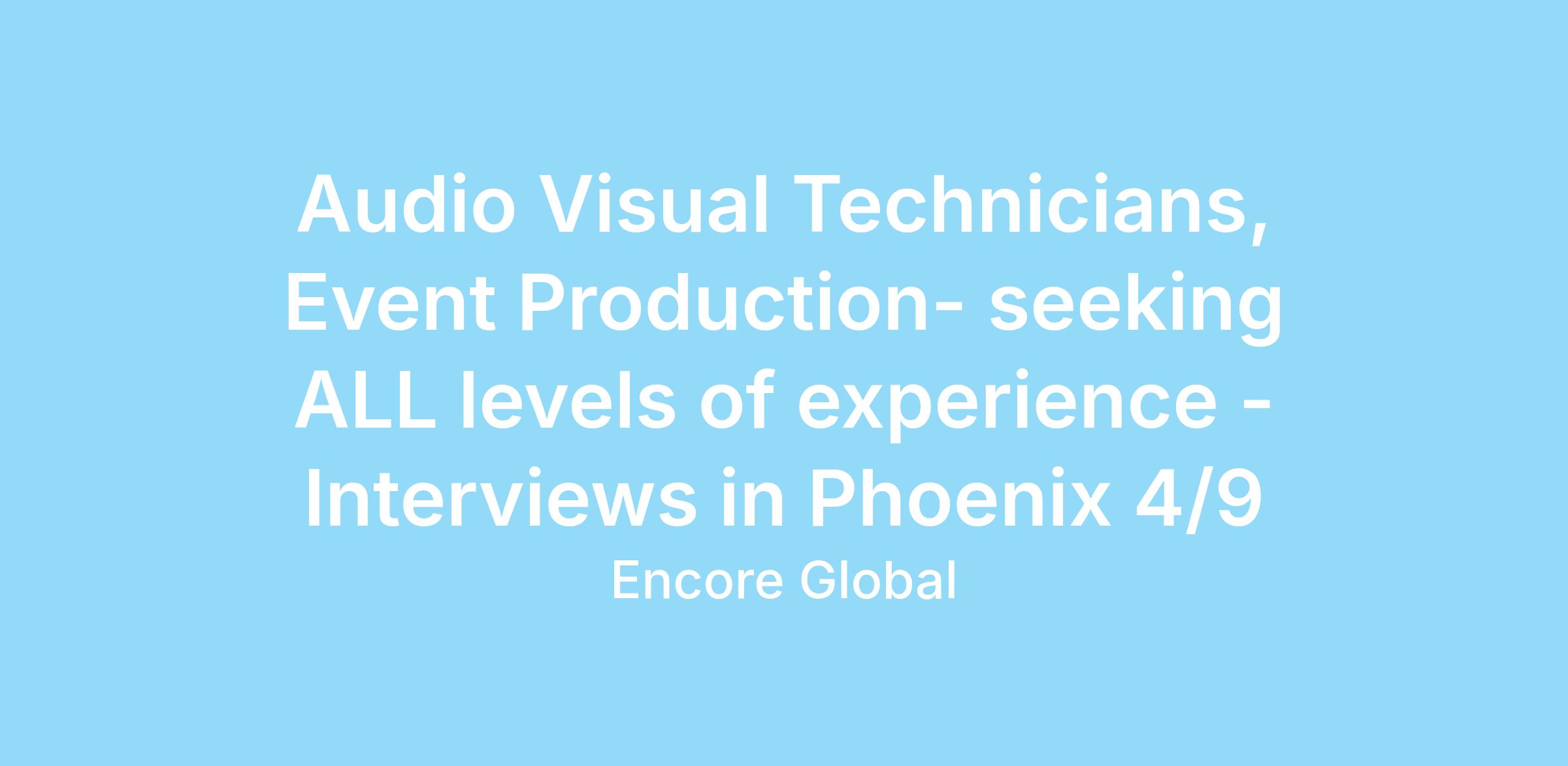 We will be hosting on-site interviews in the Phoenix market on Thursday, April 9th (9:00 am - 11:30 am and 1:00 pm - 3:30 pm). This is an opportunity to meet with several hiring managers and key decision-makers in the region! To be considered PLEASE APPLY to the "Audio Visual Technicians, Event Production- seeking ALL levels of experience" posting on the Encore Career Site: https://jobs.encoreglobal.com. Once you apply, Encore will reach out to provide a confirmation time and confirm location details.
